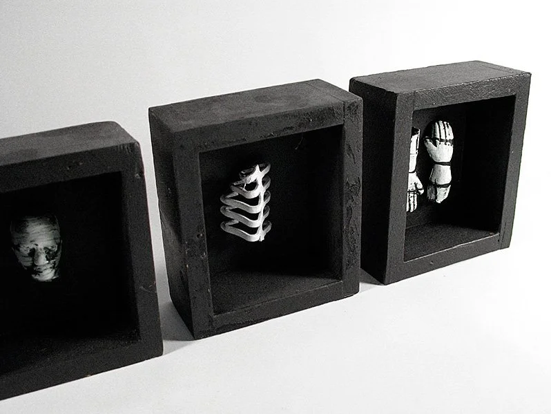 Pain Entombment Boxes, acrylic, plastic, wood, metal, 4X4.5” each